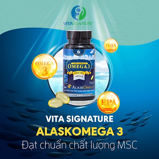 Dầu cá Alaska Omega 3 Vita Signature Bổ sung Omega - 3, EPA, DHA hỗ trợ làm giảm mỡ máu, giúp giảm nguy cơ mắc các bệnh tim mạch do xơ vữa động mạch.